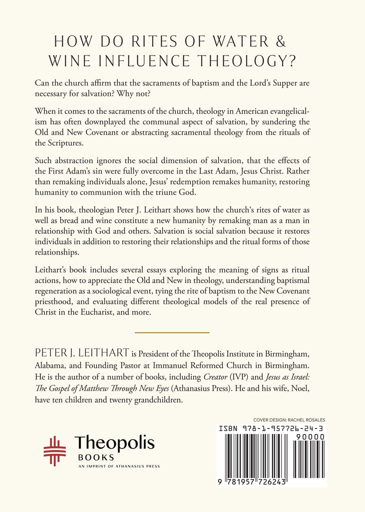 In his book, theologian Peter J. Leithart shows how the church's rites of water as well as bread and wine constitute a new humanity by remaking man as a man in relationship with God and others. Salvation is social salvation because it restores individuals in addition to restoring their relationships and the ritual forms of those relationships.
